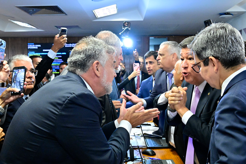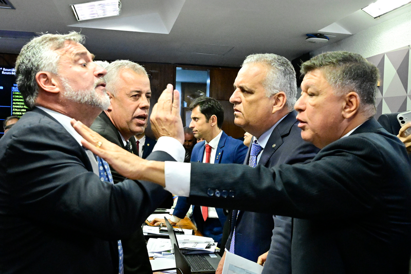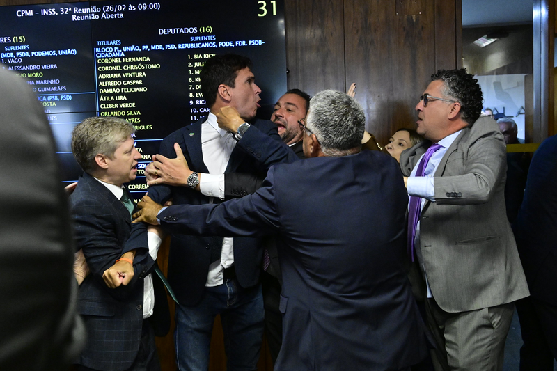 Brasilia/DF - 26/02/2026 - POLITICA - Sessão da CPI do INSS aprova quebra de sigilo bancário de filho de Lula e termina em confusão entre governo e oposição. Parlamentares que ameaçavam brigar, inclusive, tiveram de ser separados. Entre os envolvidos no empurra-empurra estão o deputado Rogério Correa (PT-MG), o relator Alfredo Gaspar (União-AL), os deputados Evair de Melo (PP-ES) e Luiz Lima (Novo-RJ). Foto: Geraldo Magela/Agencia Senado